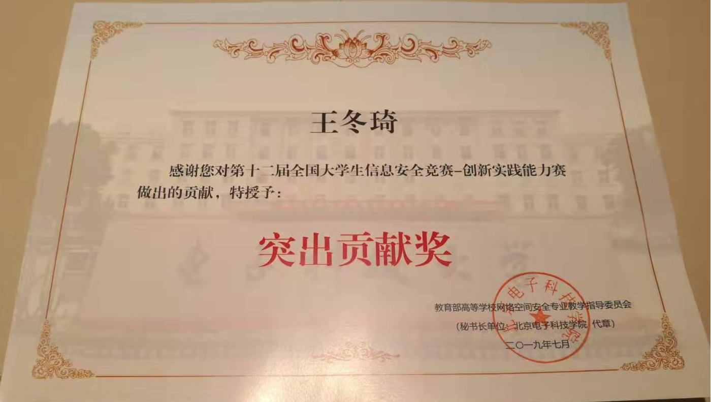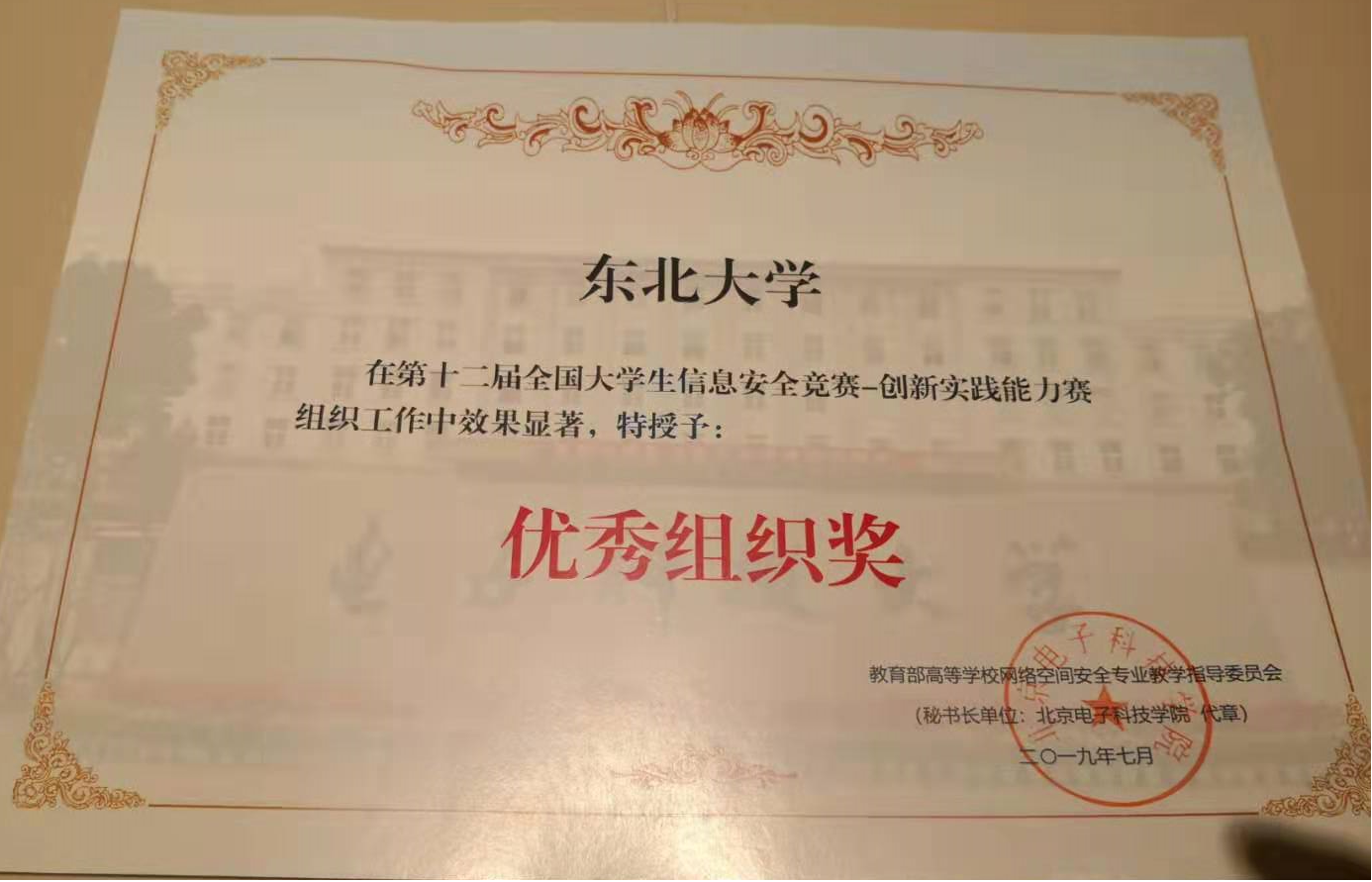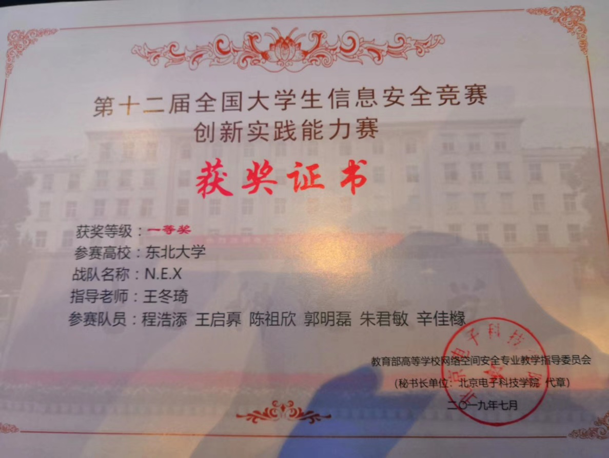 ‘全国大学生信息安全竞赛-创新实践能力赛’是目前国内最高级别的信息安全大赛之一,本届比赛全国共有455所高校,1316支队伍,6027名学生参赛,365英国上市公司官网N.E.X战队以东北区冠军身份闯入决赛,并在总决赛80支队伍中最终成绩排名第12位,是我校乃至东北地区高校历年最佳成绩,365英国上市公司官网因为在分区赛组织中的突出贡献被授予‘优秀组织奖’,N.E.X战队指导教师王冬琦老师被授予大赛的突出贡献奖。据悉,N.E.X战队不只面向计算机相关专业吸纳成员,全校所有专业学生都可以参与队员选拔。