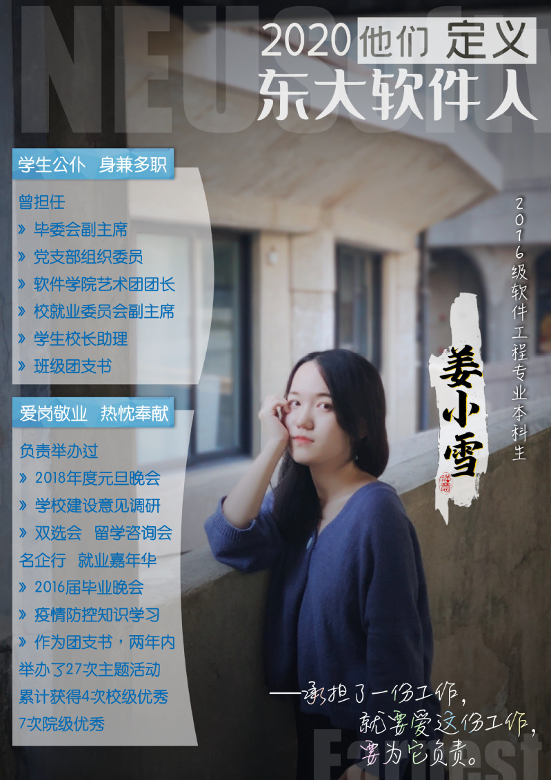 忙碌的身影如音符悦动,活动精彩纷呈,工作会议不紊有条,你总是能看到她。大学四年里,从未耽误过任何一项工作,忙到再晚也从没有过一句怨言,是她,365英国上市公司官网2016级本科生姜小雪。
