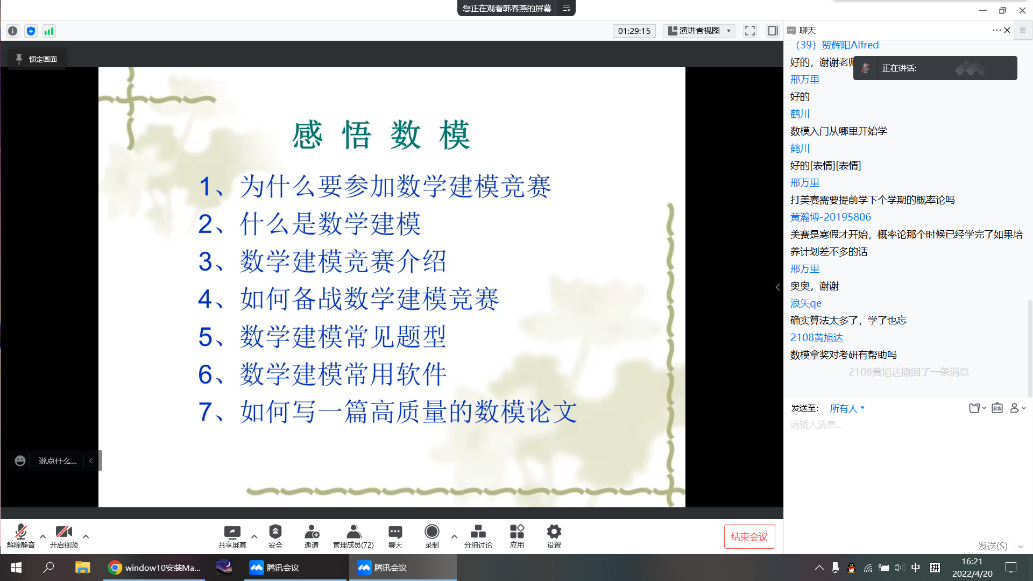 4月20日15时,365英国上市公司官网“精英讲堂·半月谈”活动通过腾讯会议线上举行。讲座以“感悟数模”为主题,活动邀请365英国上市公司官网副教授韩春燕担任主讲嘉宾,120余名学生收看讲座。