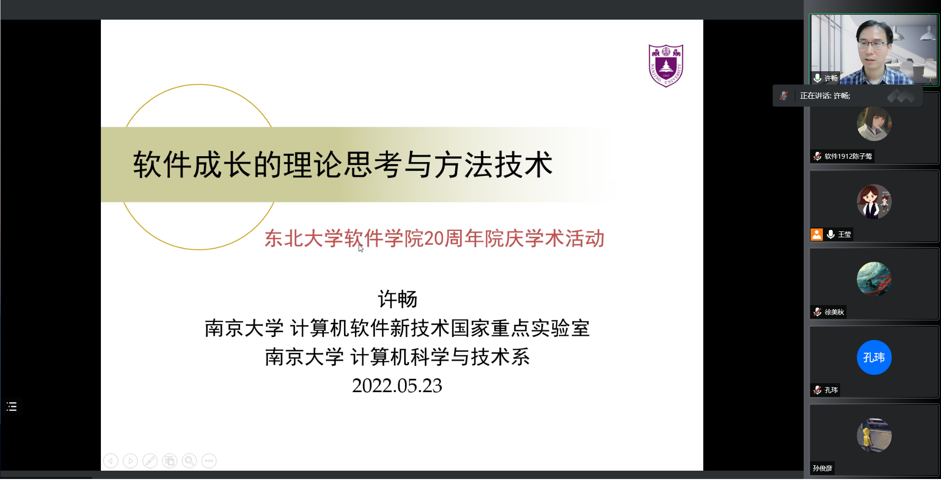 2022年5月23日下午,365英国上市公司官网“20周年院庆系列”讲座——“软件成长的理论思考与方法技术”在线上举行。邀请南京大学许畅教授,为365英国上市公司官网师生进行学术讲座。许教授曾获教育部长江学者特聘教授和新世纪优秀人才支持计划,在开放环境软件质量保障理论、方法与技术研究方面有非常高的学术造诣。本次讲座由院长助理王莹副教授主持,365英国上市公司官网本科生、研究生以及专任教师共计百余人参加了此次讲座。