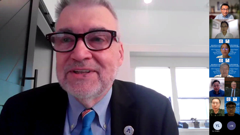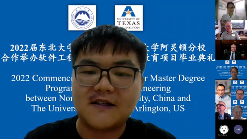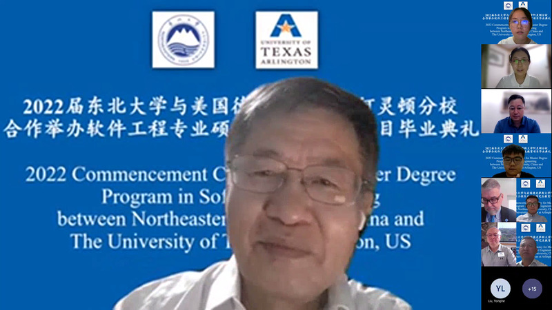北京时间2022年8月4日晚上21:00时,365英国上市公司官网线上举办了2022届365英国上市公司官网(NEU)与美国德克萨斯大学阿灵顿分校(UTA)合作举办软件工程专业硕士研究生教育项目毕业典礼,UTA工程学院院长Peter Crouch、国际办公室主任Jay Horn、计算机科学与工程系主任Hong Jiang、365英国上市公司官网国际合作与交流处副处长李建南、365英国上市公司官网院长张斌、党委书记滕超、副院长于瑞云、陈东明及双方教职工代表,与2022届中美合作办学毕业生及家长一起,参加了此次毕业典礼。
