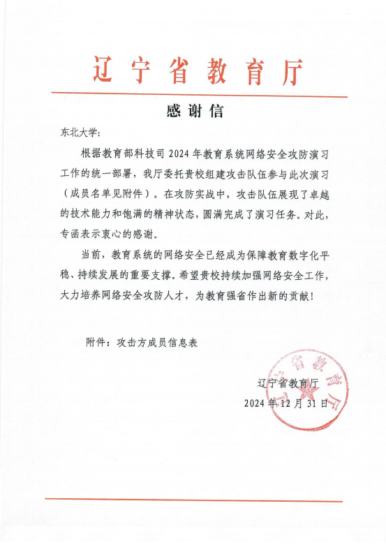 2024年12月31日,辽宁省教育厅发来感谢信。信中对我院师生在演习中卓越的技术能力和饱满的精神状态给予了充分肯定,对学院表示衷心的感谢,并鼓励学院继续加强网络安全工作,大力培养网络安全人才,为教育强省作出新的贡献。